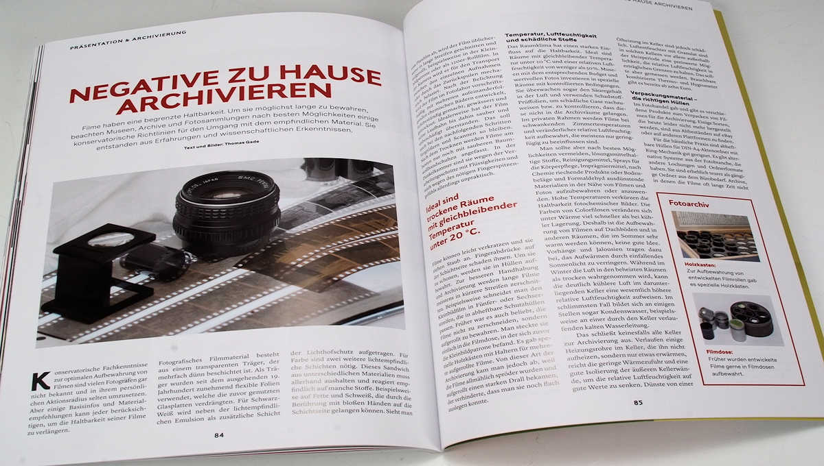 Mit dem Thema der Archivierung befassen sich gleich zwei sehr lesenswerte Beiträge, einmal die Vorstellung des digitalen Service von Cewe zur Digitalisierung von analogem Film- und Bildmaterial, dann aber auch der Artikel «Negative zu Haus archivieren», im welchem Tomas Gade viele wichtige Hinweise zur Aufbewahrung von Filmen und Prints gibt. Man kann dabei nicht vorsichtig genug sein, wenn die analogen Schätze weiterhin Bestand haben sollen.