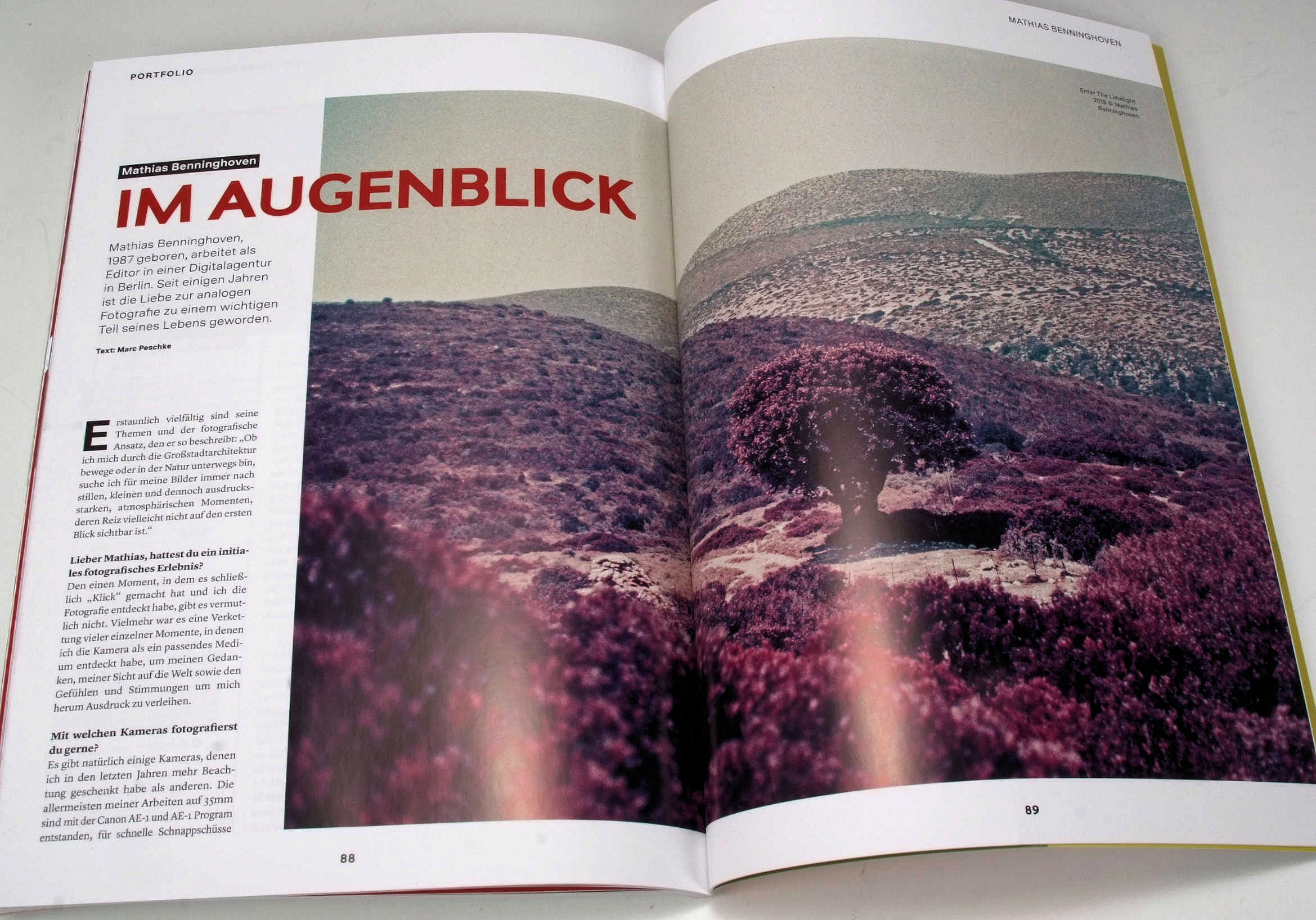 Schlusspunkt setzt das Portfolio «Im Augenblick» zu dem Arbeiten von Mathias Benninghofen. Der Editor einer Digitalagentur hat die analoge Fotografie für sich entdeckt und erklärt in einem spannenden Interview seine Vorlieben und Arbeitsweisen.