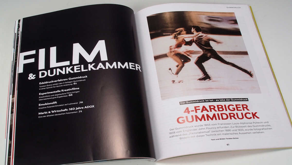 Die Rubrik «Film & Dunkelkammer» wartet in jedem Heft von PhotoKlassik mit interessanten Beiträgen für jene auf, die in ihrem Heimlabor gerne mit interessanten Effekten experimentieren und wertvolle Unikate herstellen. Heute ist der 4-farbige Gummidruck an der Reihe, ein aufwändiges Edeldruck-Verfahren, das an den Pikorialismus erinnert und auch heutige Fotos originell zur Geltung bringt. Die Anleitung dazu und viele Tipps gibt der Autos Torsten Grüne.