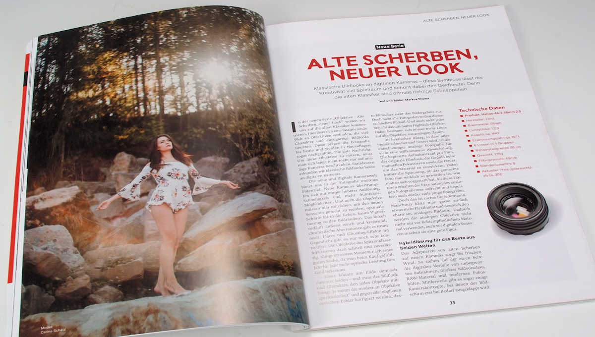 Markus Thoma beginnt in diesem Heft eine neue Serie über «Alte Scherben, neuer Look». Viele nicht mehr gebrauchte Objektive liegen in Schubladen und Schachteln, dabei wären sie für interessante Bildeffekte in der experimentellen Fotografie durchaus sinnvoll einsetzbar. Er stellt in seinem Artikel den Klassiker Helios 44-2 2,0/58 mm vor und gibt Tipps, wie man damit stimmungsvolle Porträts macht.