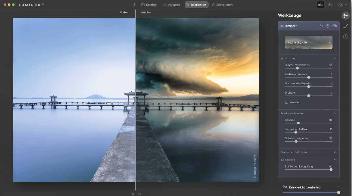 Nicht nur der Himmel kann mit dem Skylum Luinar AI Update 2 automatisch ersetzt werde, sondern auch die dazu passenden Reflexionen im Wasser