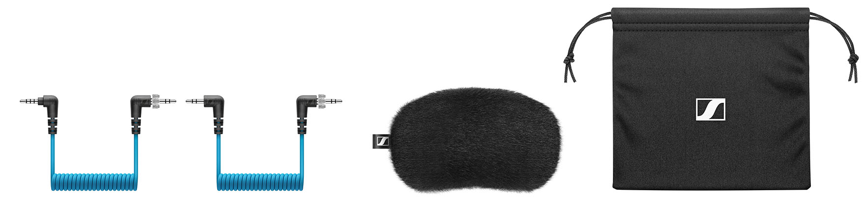 Der Lieferumfang des MKE 400 umfasst neben dem Mikro zwei Audio-Spiralkabel mit fixierbaren Stecker auf einer Seite, Fell-Windschutz und Transportbeutel sowie Kurzanleitung.