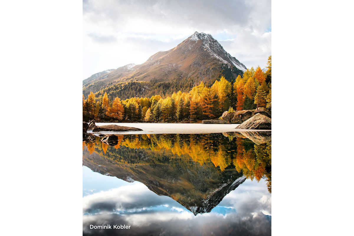 Der Bündner arbeitet im Unterland, fährt jedoch fast jedes Wochenende nach Hause in die Berge. Seine Kamera ist immer mit dabei: «Die Fotografie ist für mich ein Hobby, bei dem ich wirklich abschalten kann und einfach Zeit für mich habe, wo ich die Eindrücke der Woche sacken lassen kann und neue Energie tanke um wieder in die Woche zu starten». Wer seinen Instagramkanal @dominik.kobler kennt, der weiss, dass Kobler ein Experte für Naturfotos ist. Über die Entstehung des Fotos berichtet er: «Bergseen sind immer wieder eine riesige Challenge. Zum Teil muss man vier bis fünf Mal hochfahren, bis man die Spiegelung überhaupt erwischt. Denn wenn es zu fest luftet, dann ist es vorbei mit der Spiegelung.». Das Timing war bei diesem Foto besonders wichtig, denn sobald der erste Schnee fällt, verlieren die Lärchen ihre goldenen Nadeln. Manchmal sei es ganz schön stressig, so ein Foto zu machen – schliesslich sei man immer auf der Suche nach dem besten Fotospot am See: «Man springt von einem Eck ins andere. Und eine Minute später sind vielleicht die Wolken vor der Sonne oder sie verschwindet ganz hinter den Bergen. Es sind wirklich wenige Sekunden, die diesen Moment ausmachen». Genau das macht das Foto für Kobler so besonders.