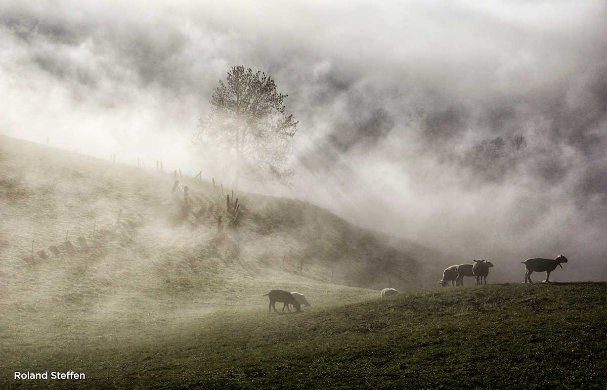 Eine Gruppe von Schafen im mystischen Nebel – man muss schon etwas genauer hinsehen, um dieses Foto von Roland Steffen komplett zu erfassen. «Das Bild zeigt eine ganz persönliche Sicht auf die Schweiz. Der Fotograf hat das Wettbewerbsmotto damit sehr authentisch umgesetzt», lobt Jurymitglied Sarina Flück. Auch die gute technische Ausführung wurde von der Jury besonders hervorgehoben. Fotoprofi Marc-Dave Maier betont die gute Bildaufteilung: «Eine herausragende Komposition, die durch den Nebel ungewöhnlich mystisch wirkt».