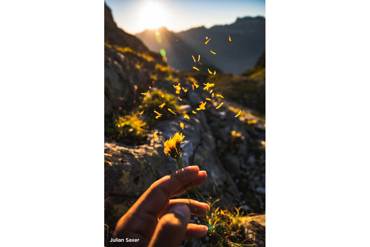 «Egal welchen Hügel wir erklimmen, wir können unsere Lunge mit frischer Bergluft füllen und uns stärken», so beschreibt Julian Saxer sein Foto. Es überzeugt mit einer subtilen Dynamik in den fortfliegenden Blütenblättern und vermittelt dem Betrachter eine sorgenfreie, entspannte Auszeit in den Bergen. Jurymitglied Michael Joos ist begeistert: «Es ist eine kreative Idee, es ist emotional und es lässt Spielraum für Interpretationen. Man kann sich durch die starke Ich-Perspektive besonders gut in den Moment hineindenken».