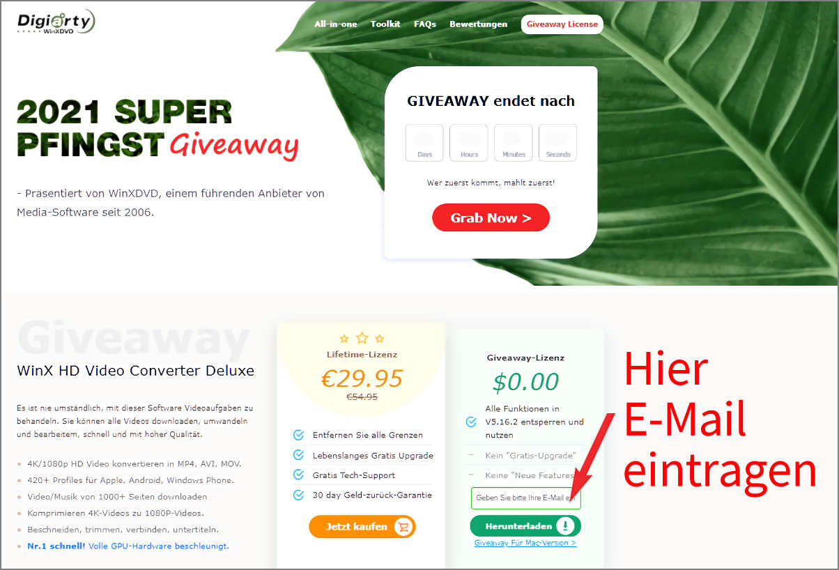 Hier geht es zur Pfingst-Giveaway-URL. Tragen Sie ihre E-Mail-Adresse ein, um augenblicklich Ihre kostenlose Lizenz zu bekommen. Die Pfingstaktion endet am 31. Mai 2021.