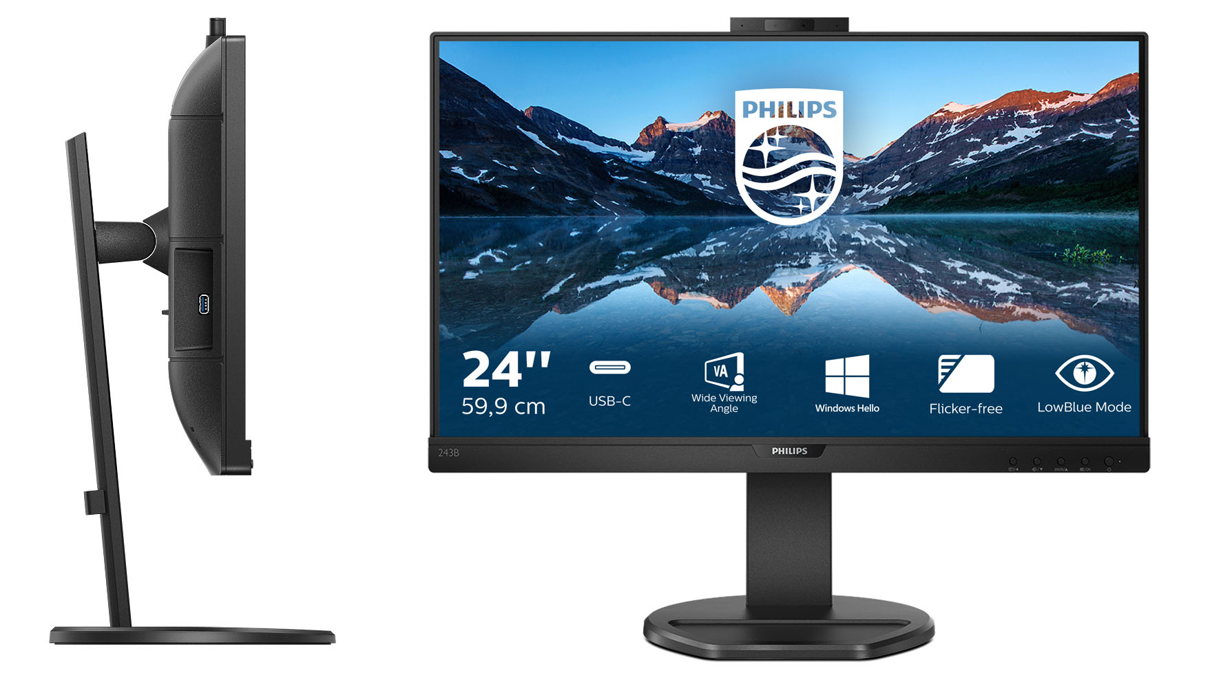 Mit dem neuen 23,8 Zoll bzw. 60,5 cm grossen Philips 243B9H Fkommt nun ein Full-HD-Monitor mit Betrachtunsgwinkel-unabhängigem IPS-Panel, einer Bildwiederholfrequenz von 75 Hz und einer aus Sicherheitsgründen versenkbare Webcam ist ein für 300 Franken neu auf dem Markt. Zudem verfügbat er über einen integrierten USB-C-Hub (1 zu 3) für schnelles USB 3.2 Gen 1, der zusammen mit dem integrierten Netzteil den Kabelsalat reduziert und so für einen aufgeräumten Arbeitsplatz sorgt.
