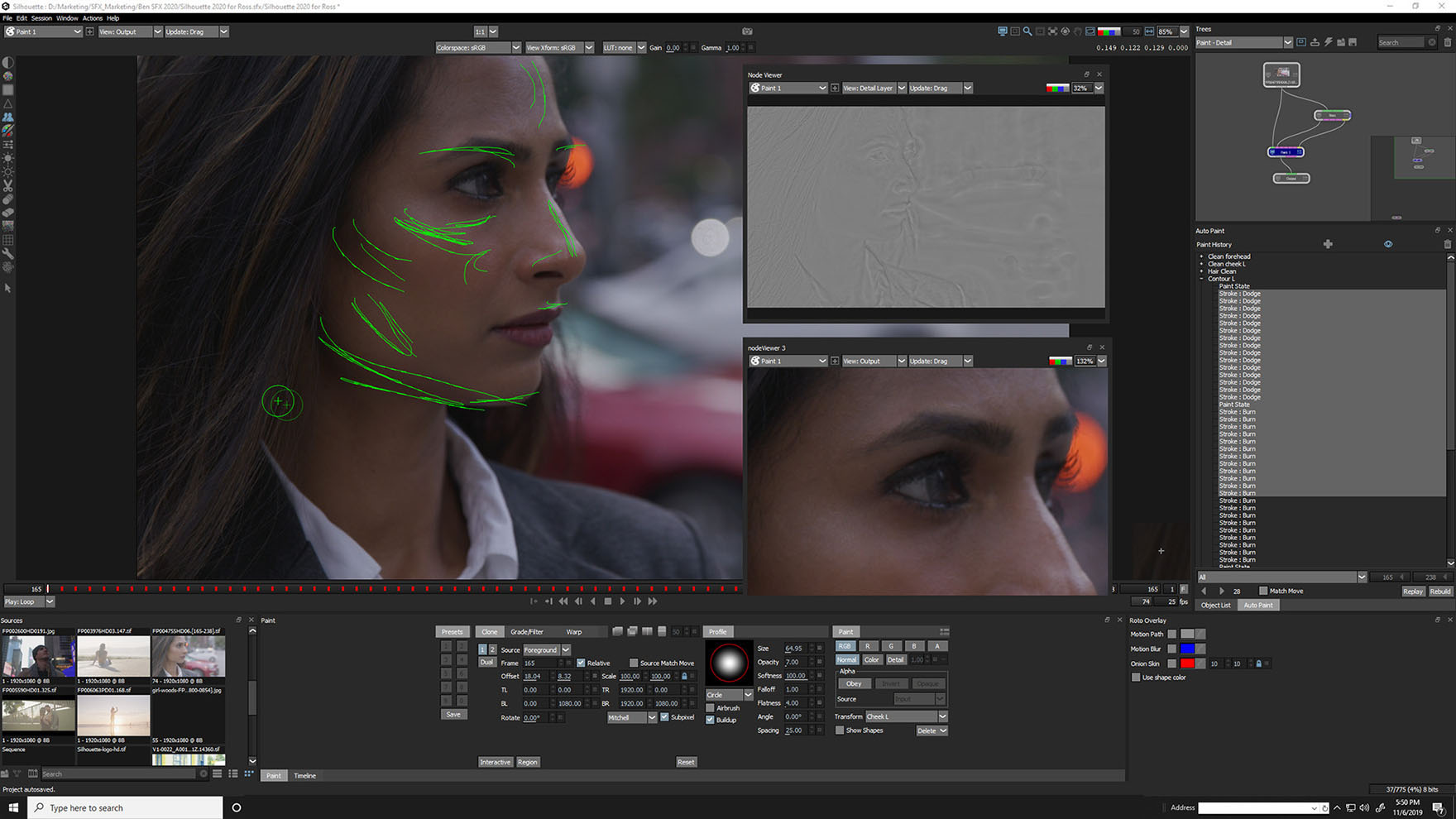 Die Benutzeroberfläche von Silhouette für das nicht-destruktive Malen in Filmsequenzen: Hier wird das Gesicht der Schauspielerin mit Pinselstrichen (grün markiert) partiell optimiert, wie man dies in Photoshop mit verschiedenen Pinselwerkzeugen (Aufhellen, Reparieren u.ä.) machen würde.