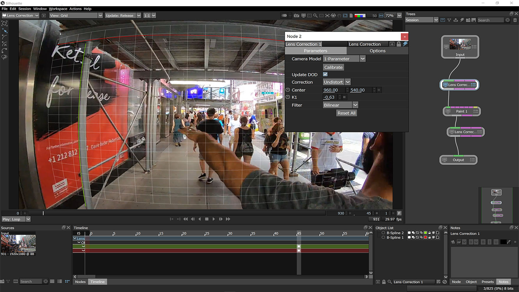 Objektiv-Korrektur in Silhouette: Die Einstellungen, die stets auf viele nachfolgende Bilder einer Sequenz angewendet werden sollen, werden in Silhouette als Nodes bzw. als Verknüpfungen von Anweisungen/Einstellungen angezeigt, was im rechten Teil dieses Screenshots zu sehen ist..