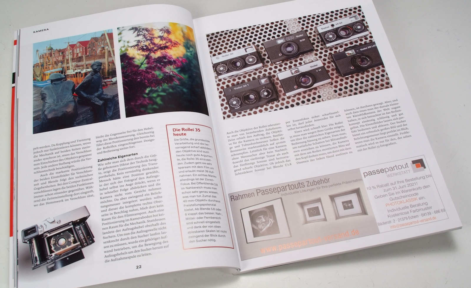 Es geht um die Rollei 35, eine der erfolgreichsten Kameras in der Geschichte der Fotografie. Wie viele Varianten es davon gab und worin sich diese unterscheiden schildert Steffen Schüngel, durchmischt mit vielen spannenden Hintergrundinformationen. Gleich danach folgt ein aufschlussreicher Artikel über die derzeit lieferbaren Analog-Kameras – es gibt mehr davon als man denkt.