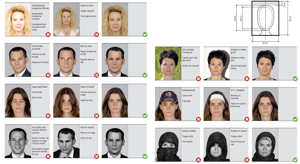 Weitere Informationen zu den Anforderungen von Passbildern finden Sie als pdf bei Fedpol (Fotomustertafel)