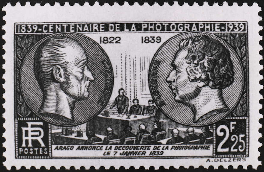 Die beiden Erfinder Niépce und Daguerre auf der französischen Gedenkmarke zu 100 Jahre Fotografie 1939. Die Marke weist einen Fehler auf: Am erwähnten 7. Januar 1839 informierte Dominique Arago die Akademie der Wissenschaft über die Erfindung Daguerres, während die Abbildung die Bekanntgabe der Fotografie vom 19. August zeigt.
