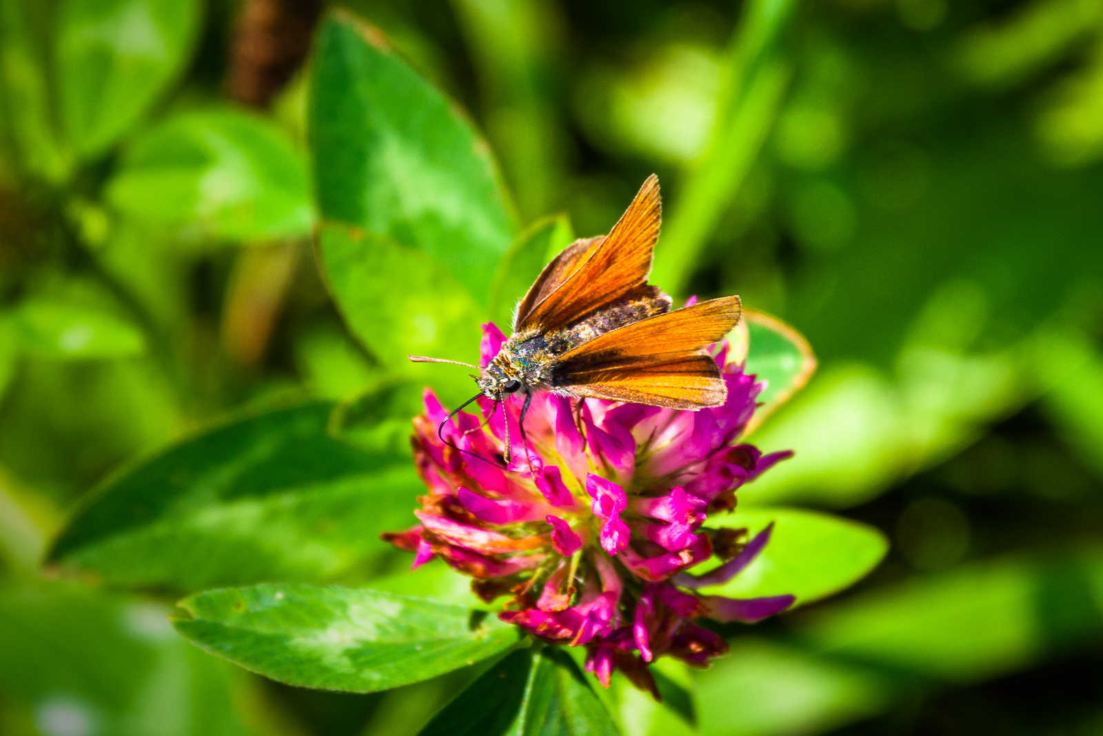 Schwarzkolbiger Braun-Dickkopffalter auf einer Rotkleeblüte (85mm f8)