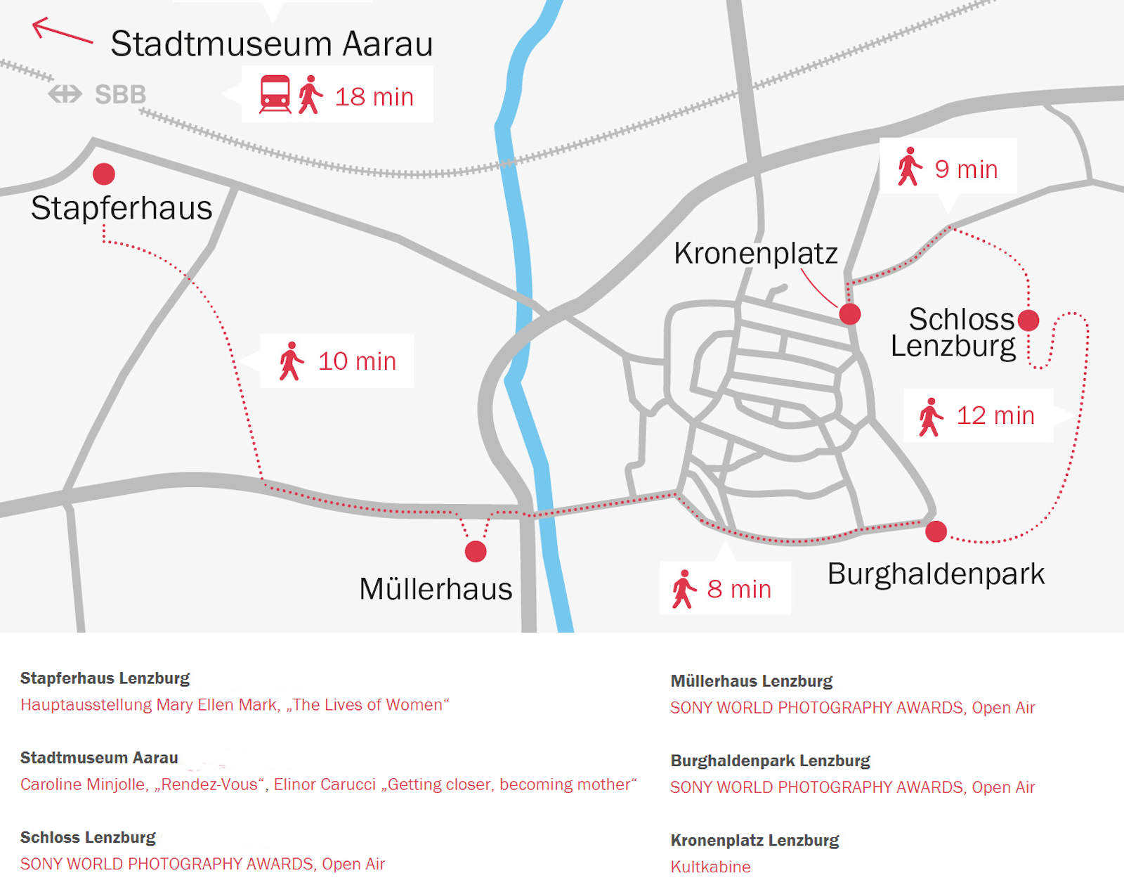 Das Fotofestival Lenzburg findet dieses Jahr bereits zum vierten Mal statt und bietet den Fotointeressierten vier hochkarätige Ausstellungen: Die Hauptausstellung im Stapferhaus Lenzburg ist der amerikanischen Fotografin Mary Ellen Mark gewidmet, mit ihrer Serie «The Lives of Women». Weiter sind diesmal im Schloss Lenzburg die Topbilder des «Sony World Photography Awards» zu sehen. Das dritte Highlight sind die Bilder von Elinor Carucci «Getting closer, Becoming Mother: About Intimacy and Family», die im Stadtmuseum Aarau präsentiert werden. Und schliesslich runden die Bilder «Rendez-vous» von Caroline Minjolle das Ausstellungsangebot ab, die ihre beiden Söhne seit 1995 jeden Monat fotografiert hat. Weiter gibt es Workshops, Portfoliobesprechungen, Vorträge und begleitende Veranstaltungen an verschiedensten Orten der Stadt wodurch das Festival mit verschiedenen fotografischen Positionen abgerundet wird.