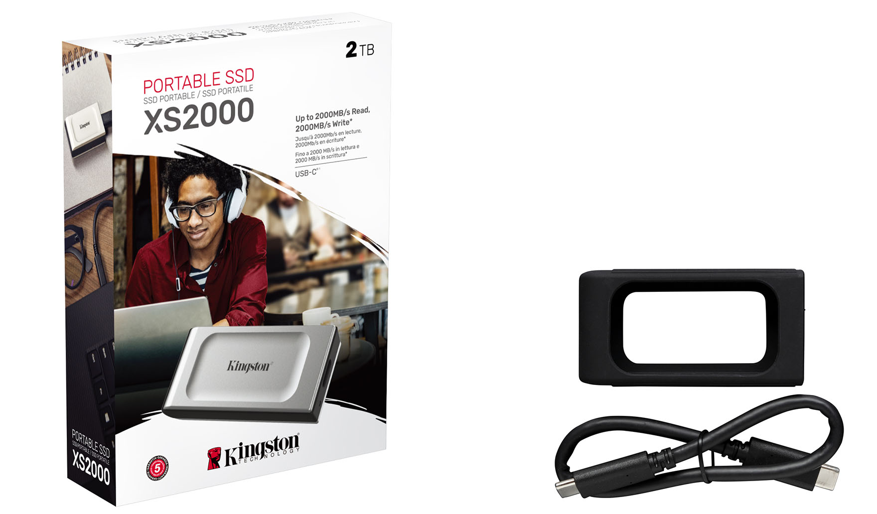 Lieferumfang | SSD Kingston XS2000 Schwarze Gummihülle für SSD Kingston XS2000 USB-3.2-Kabel mit beidseitigen Typ-C-Steckern |