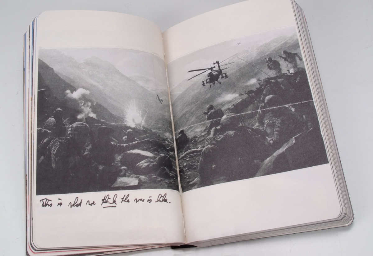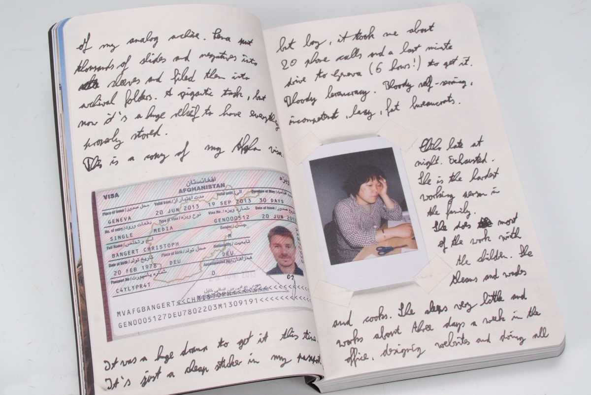 Neben seinen handschriftlichen Aufzeichnungen stehen Bilder vor allem aus Afghanistan, die heute wieder aktueller sind denn je. Die Leute, die er traf, hat er mit einer Sofortbildkamera porträtiert und ins Buch «eingeklebt», genauso, wie Visas, Banknoten und andere Dokumente, die er für seine Reisen brauchte. Die Kriegsbilder sind doppelseitig präsentiert. Ohne Legenden – es braucht sie nicht. Christoph war von 2005 bis 2013 in den beiden Kriegen in Afghanistan und dem Irak unterwegs. Zwei Kriege, die für Nichts gewesen sind, die aber Tausende von Toten und viel Not und Elend gebracht haben. Christoph hat als junger Fotograf das Abenteuer gesucht, hat die unsinnige Brutalität des Krieges hautnah erlebt – prägend und unvergesslich. Seine Erlebnisse sind in drei Büchern festgehalten, in «War Porn» (Kehrer 2014), «hello camel» (Kehrer 2016) und in dem hier vorliegendem letzten Buch der Reihe, «Rumors of War» (Kehrer 2021).