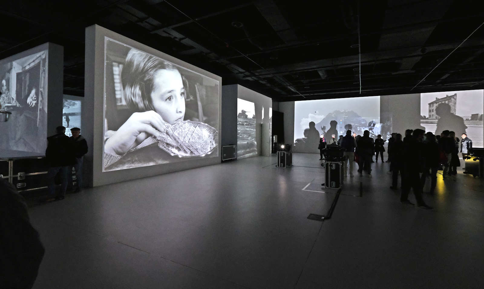 Noch ist das Untergeschoss des «Photo Elysee» eine riesige Halle, die noch unterteilt wird. Grossprojektionen an den Betonwänden zeigen den Besuchern, was hier dereinst zu sehen sein wird.