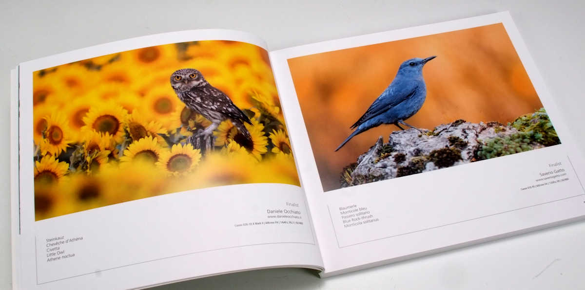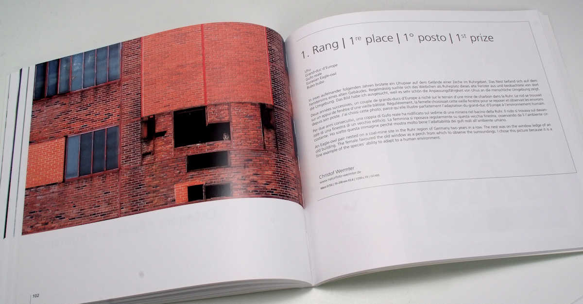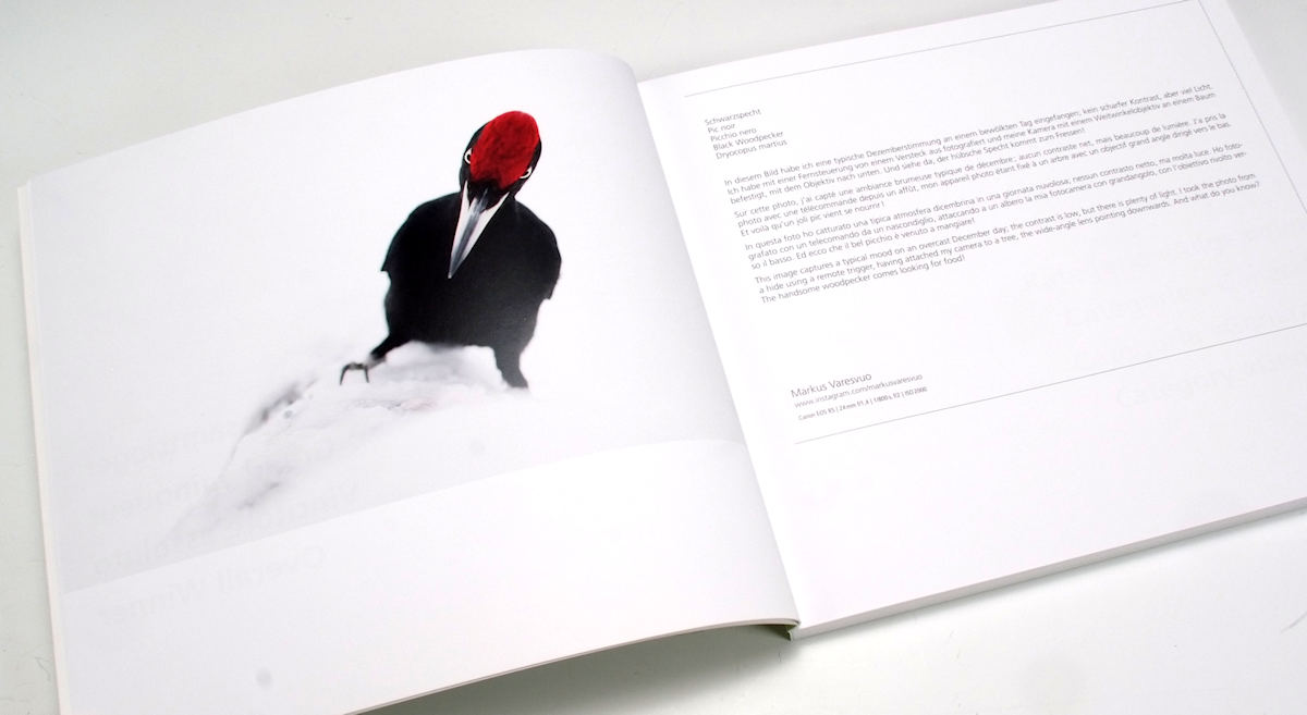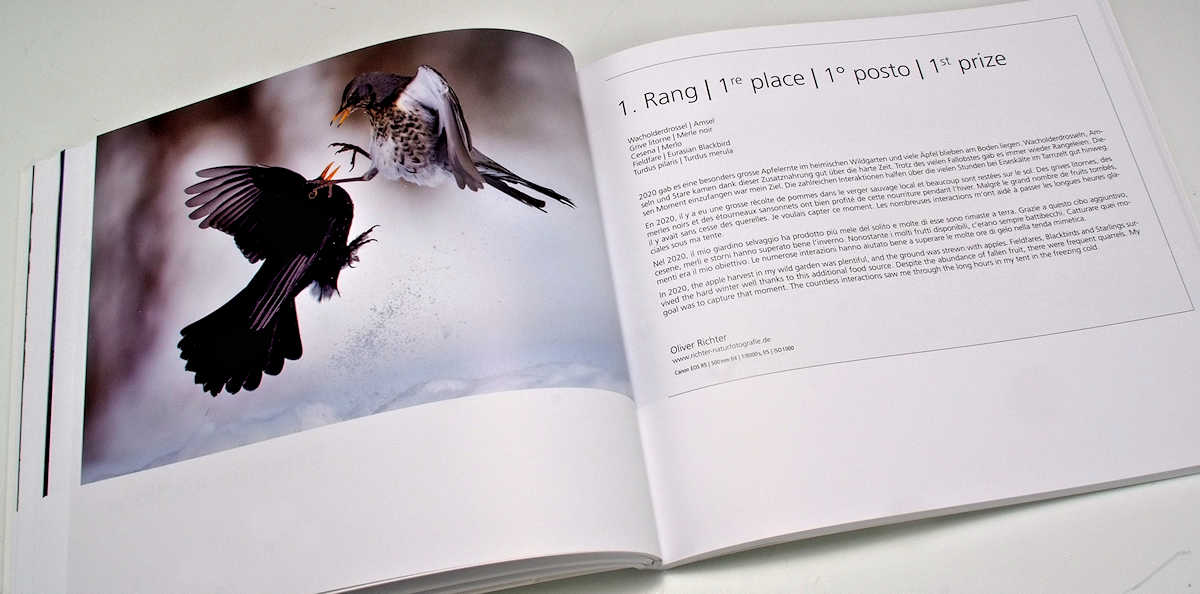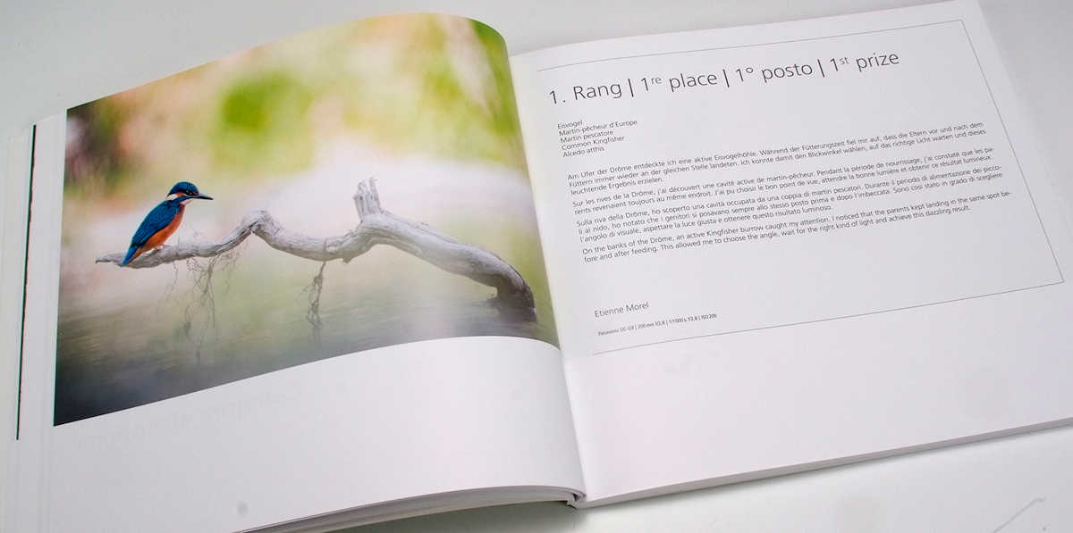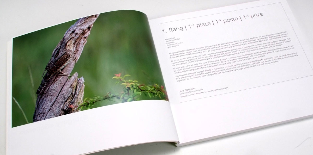 Um so respektvoller begegnet man den Gewinnerbildern und denjenigen der Endauswahl, die nun in «Portfolio 9» (zum ersten Wettbewerb wurde noch kein Bildband herausgegeben) veröffentlicht sind. Wie schon in den früheren Bänden ist es eine reichhaltige Sammlung ungewöhnlicher und qualitativ hochstehender Aufnahmen, welche in diesem Bildband ihre Liebhaber finden. Wiederum lehnt sich die Abfolge im Buch an die vier Wettbewerbskategorien «Allgemein», «Emotion», «Aktion» und «Vogel und Mensch» an, wobei letzte neu anstelle der früheren Kategorie «Jugend» trat. Im Buch besonders hervorgehoben ist das Bild des Gesamtsiegers und die drei Fotos der Kategorienbesten, denen je eine Doppelseite gewidmet wird, während die anderen Bilder mit den Legenden jeweils ganzseitig präsentiert werden. Die Fotos der Hauptgewinner werden von einem Text begleitet, der Wissenswertes zur Vogelart und zur Aufnahmesituation enthält. Die Texte im Buch sind durchgehend in den vier Sprachen, Deutsch, Französisch, Italienisch und Englisch verfasst, um der internationalen Teilnehmer- und Leserschaft gerecht zu werden.