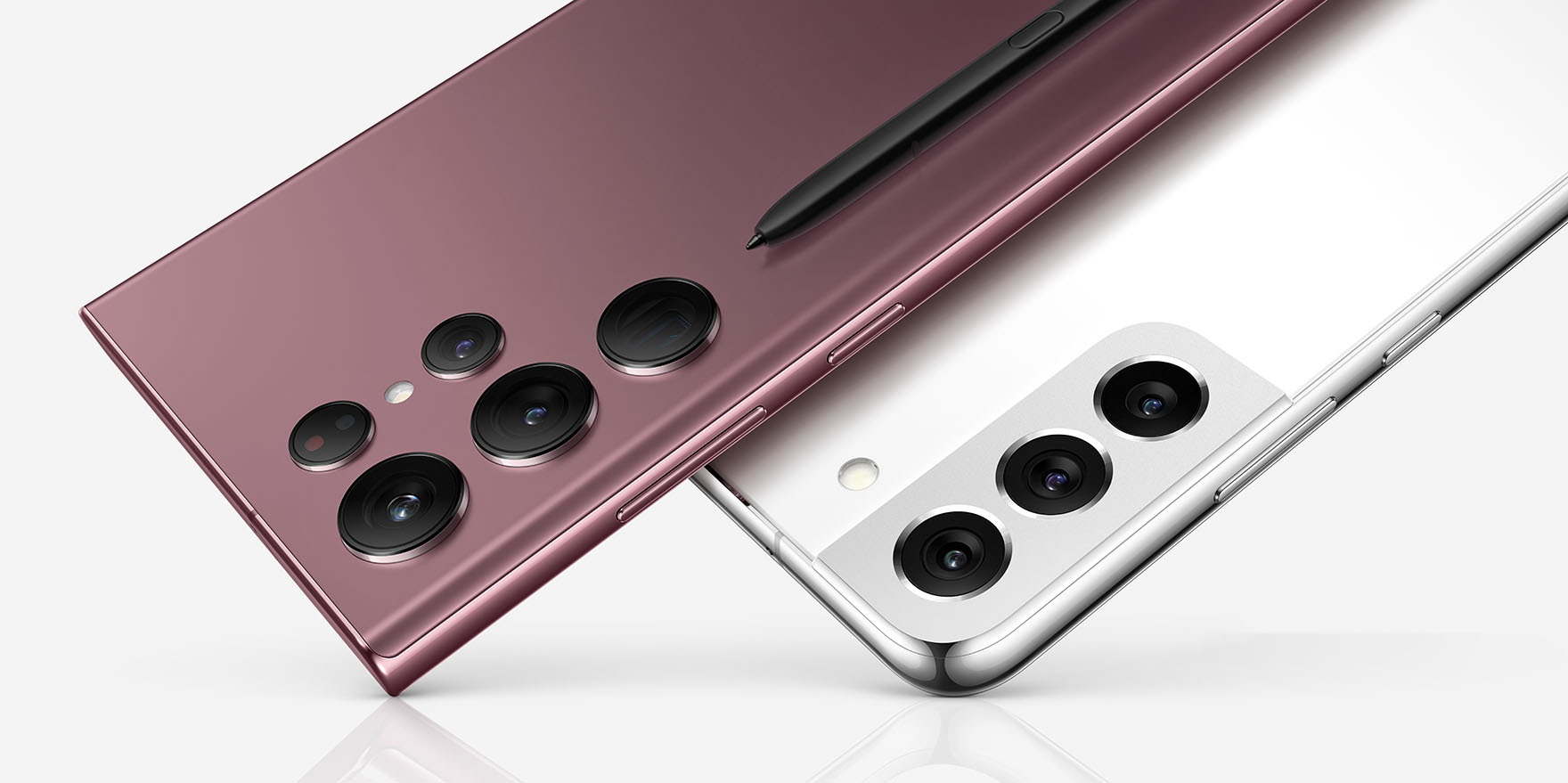 Design-Unterschiede zwischen dem S22 Ultra (hier in Burgunderrot) und dem S22/S22+ (hier in Weiss). werden einerseits an den Kanten (oben-unten sowie Seiten) und auch bei der Integration der Kameragruppe deutlich.