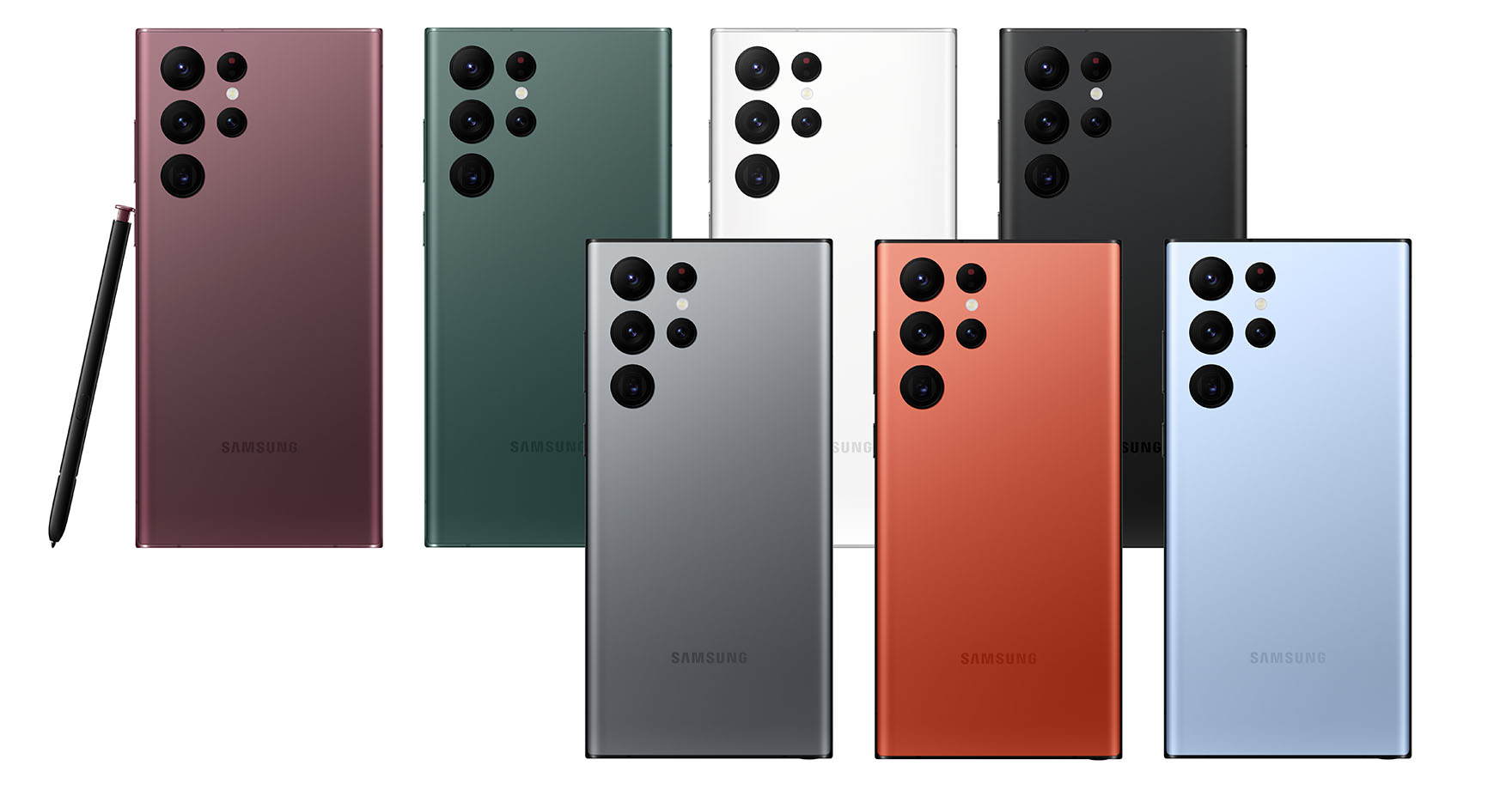 Farbvarianten des S22 Ultra: oben die vier Standardfarben und unten die nur im Online-Shop von Samsung erhältlichen Farbvarianten.
