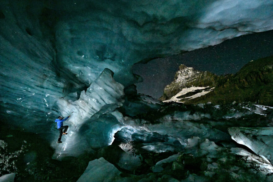 Zusätzlich zu seinem bildnerischen Vergleich von damals und heute wollte Thomas ein Bild aufnehmen, das die Menschen inspiriert, begeistert und dazu bringt, sich ernsthaft um das Ökosystem der Gletscher zu sorgen. Mit dieser Idee betrat er durch eine der vielen zauberhaften Höhlen den Gletscher selbst, um dessen physische Schönheit aufzuzeigen. Er suchte und fand eine Höhle mit einer majestätischen Öffnung, in deren Mitte das unverwechselbare Matterhorn zu erblicken war. Er wusste: Dies war die perfekte Stelle. Um dem permanenten Schmelzwasser auszuweichen, wartete Thomas bis nach Mitternacht, um diese Aufnahme zu machen – in einer stockfinsteren Höhle und bei eiskalten Temperaturen.
