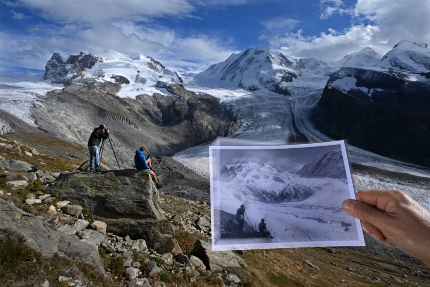 In den letzten 100 Jahren ist das Gletschereis so schnell geschmolzen wie nie zuvor. Die Gletscher in der Schweiz haben allein im letzten Jahr ganze zwei Prozent (Quelle) ihres Volumens verloren. Um dies zu veranschaulichen, machte es sich Thomas zur Aufgabe, eine Aufnahme aus dem Jahr 1959 zu rekonstruieren, auf der zwei Geologen beim Ausmessen des Gornergletschers zu sehen sind. Nach einer stundenlangen Suche in den Bergen, bei der ihm die markante Kulisse bei der Orientierung half, fand er den Fels, auf dem das Bild vor 61 Jahren aufgenommen worden war. Was er hier vorfand, erschütterte ihn. Weniger als die Hälfte des Eises von damals war im unteren Teil des Gletschers noch vorhanden.