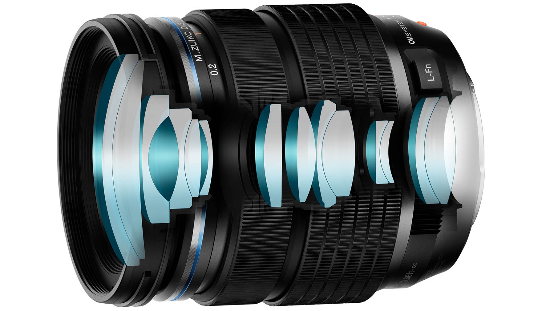 Konstruktion für erstklassige Auflösung im gesamten Brennweitenbereich: Die Linsenkonstruktion dieses Modells besteht aus 14 Elementen in 9 Gruppen (1 EDA-Linse, 2 asphärische Linsen, 1 DSA-Linse, 2 ED-Linsen, 1 HD-Linse, 2 HR-Linsen) mit 4 effektiv positionierten asphärischen Linsen einschliesslich einer DSA-Linse. So wurde die für ein «M.Zuiko Pro»-Objektiv typische kompakte, leichte Bauweise und hervorragende Abbildungsleistung möglich.