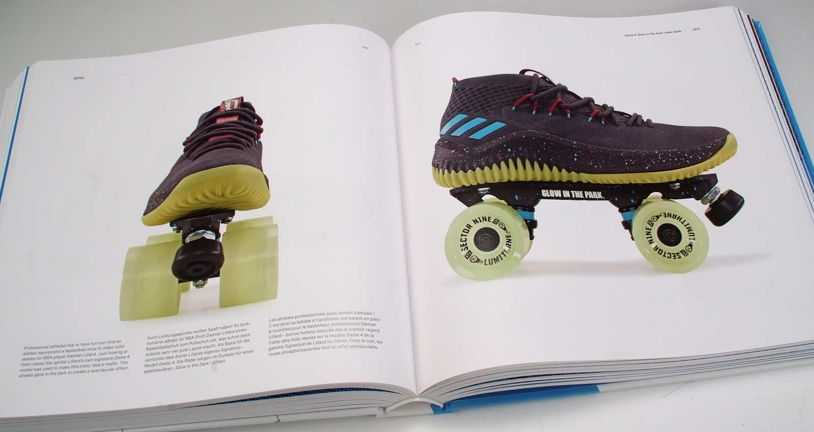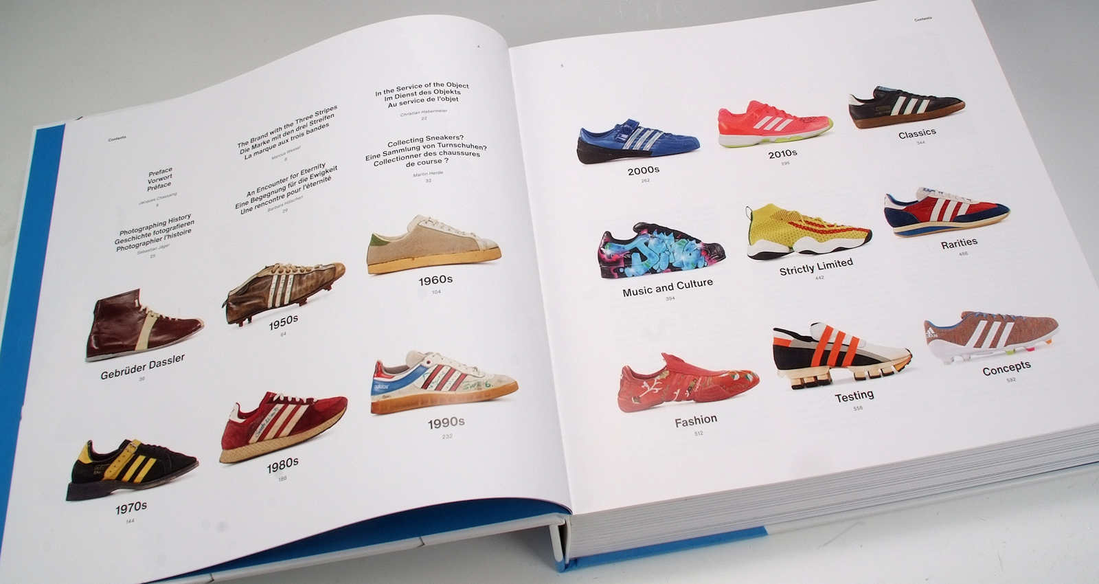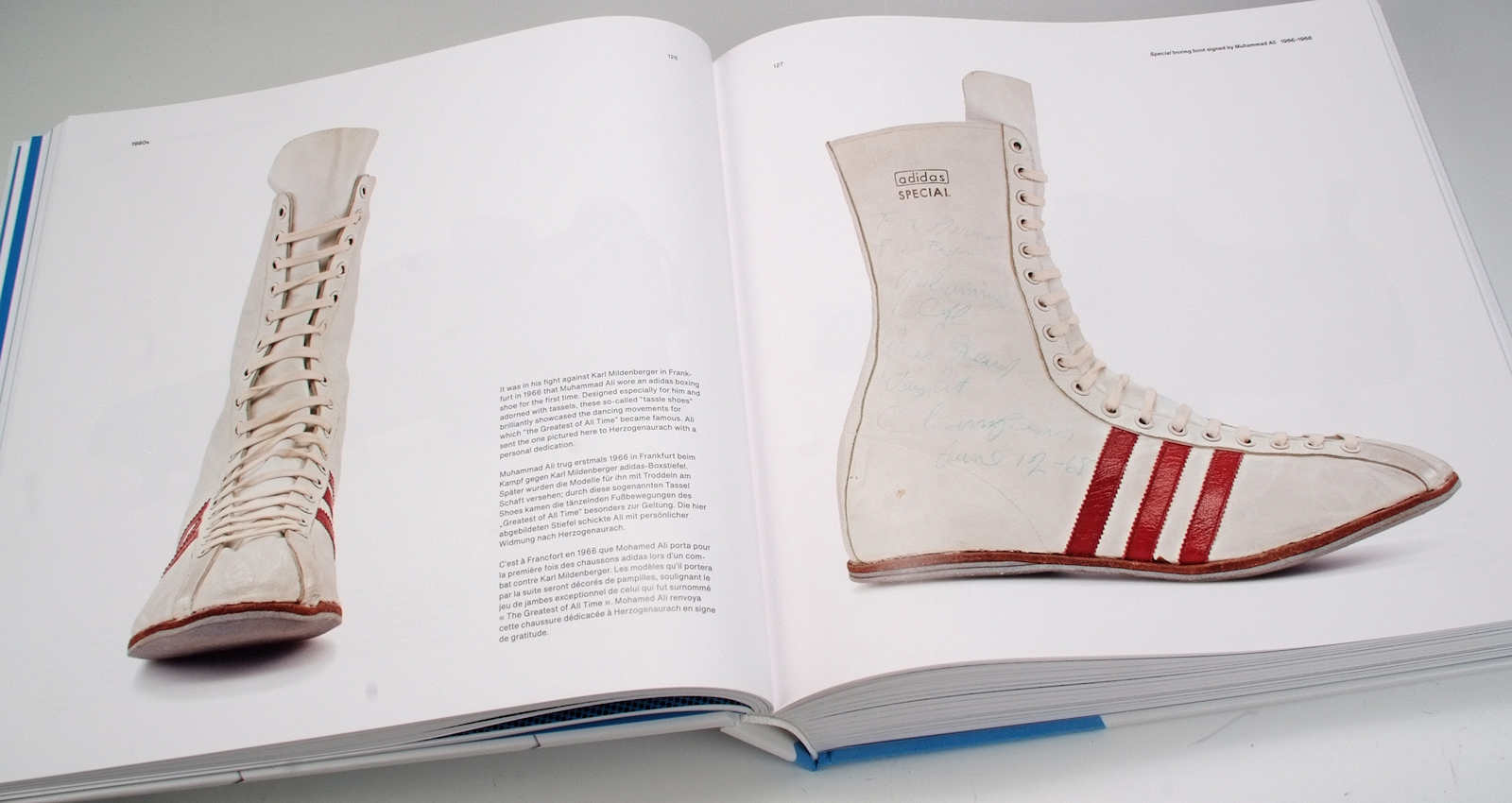 Die Vielfalt dieser Kollektion wird einem bewusst, wenn man die 644 Seiten durchblättert. Zunächst realisiert man, dass der Name adidas nicht nur eine Sportschuhmarke ist, sondern dass sich dahinter eine ganz bestimmte Philosophie und viel persönliches Engagement der Entwickler verbirgt. Jeder Schuh hat seine Geschichte, die in den Bildlegenden erzählt wird, die Sprintschuhe, mit denen Line Radke 1928 die Goldmedaille in Amsterdam gewann, das «Wunder von Bern», mit welchem dem Nürnberger Stürmer Max Morlock 1954 im Wankdorf-Stadion der wichtige Anschlusstreffer in der 10. Spielminute gelang, die Boxstiefel von Muhammad Ali, mit denen er 1971 im Madison Square Garden Joe Frazier besiegte, die Flügelschuhe von Jeremy Scott oder die hochabsätzigen Stiefel von Madonna. Hinzu kommen Prototypen, Testschuhe, Designmuster und Vintage-Modelle, die man noch nie zuvor gesehen hatte und kaum auch je – ausser in diesem Buch – sehen wird.
