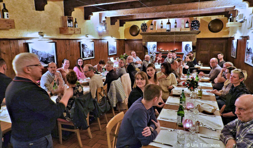 Um gastronomische Highlights ist das Tessin wahrlich nicht verlegen, und so sah der nachfolgende Programmpunkt einen gemütlichen Apéro und ein köstliches Nachtessen im «Al Grottino» statt, das etwas versteckt als Geheimtipp weniger bekannt ist. Man hatte auch Gelegenheit sich ausgiebig zu unterhalten, wobei vor allem die persönlichen Kontakte mit alten Freunden wieder gepflegt werden konnten. Für einige soll es sehr spät geworden sein …