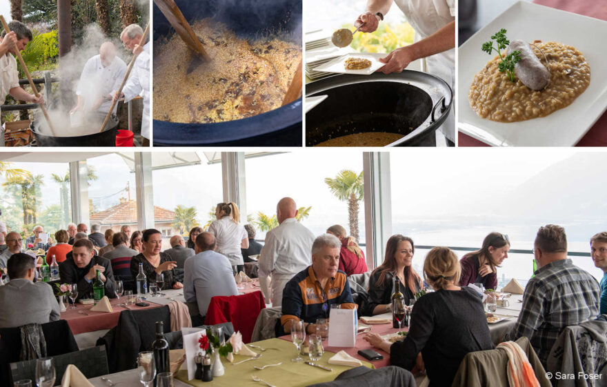 Damit kam die GV 2022 langsam zu ihrem Ende, das noch mit einem Apéro, spendiert von der Gemeinde Orselina und der Firma Rapelli, Stabio, gekrönt wurde. Dann brodelte ein kustiger Risotto nach geheimem Hausrezept des Hotel Stella in einem grossen Bottich, der mit einer typischen Salsiccia und einem köstlichen Merlot gekrönt wurde. Die GV in Orselina werden wir nicht so schnell vergessen und der Dank aller Teilnehmenden ist den Organisatoren, insbesondere Marco und Prisca Garbani, sicher.