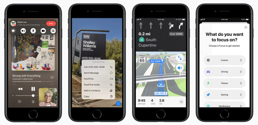Apple iPhone SE mit verschiedenen Anwendungen von iOS 15: SharePlay (Teilen bzw. gleichzeitiges Konsumieren von Filmen/TV-Sendungen etc. über eine Verbindung, LiveText (Texterkennungb in Bildern), Maps (Navigation), Focus (festlegen auf welche Aufgaben man sich fokussieren/konzentrieren will)