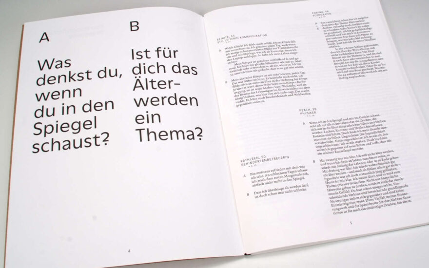 Die Porträts sind eindrücklich. Man befasst sich mit der Physiognomie, beginnt sich mit der Person auseinanderzusetzen, sucht das frühere oder spätere Pendent im vorderen oder hinteren Buchteil dazu und steigt schliesslich in den Textteil ein, um von der dargestellten Person die Antworten auf die beiden Lebensfragen zu bekommen. So befasst man sich intensiv mit den Bildern, mit der Thematik des Projektes und hinterfragt vielleicht die eigene Meinung.
