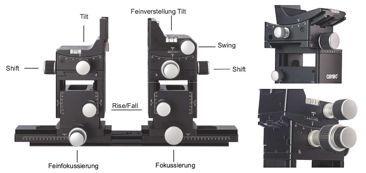 Die beiden Standarten sind so konzipiert, dass auf eine kurze Distanz zusammengefahren werden können, was den Einsatz von kurzen Brennweiten ermöglicht. Beide Standarten erlauben grosszügige Hoch-, Tief- und Vertikalverschiebungen, sowie Tilt-Bewegungen für Neigungen und Schwenkungen, um die Schärfeebene der Objektausdehnung anzupassen, um einen erweiterten Schärferaum zu erzielen. Die Einstellelemente sind selbsthemmend und können gegen versehentliches Verstellen zusätzlich arretiert werden.