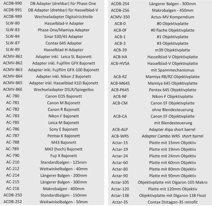 Dank der modularen Bauweise lassen sich verschiedene Zubehörteile verwenden. So gibt es beispielsweise für Phase One-/Mamiya- und Hasselblad V-Rückteile Adapter, welche die Drehung des Backs vom Quer- ins Hochformat und zurück zulassen. Auch für andere und nicht mehr lieferbare Digitalrückteile sind passende Adapterplatten lieferbar, zum Beispiel Actus ACDB 989 / WRS oder SWL. Auch lässt sich beispielsweise der Phase One X-Shutter und das IQ4-Rückteil auf die Actus-MV adaptieren, was laut Hersteller eine ideale Kombination für höchste Ansprüche darstellt.
