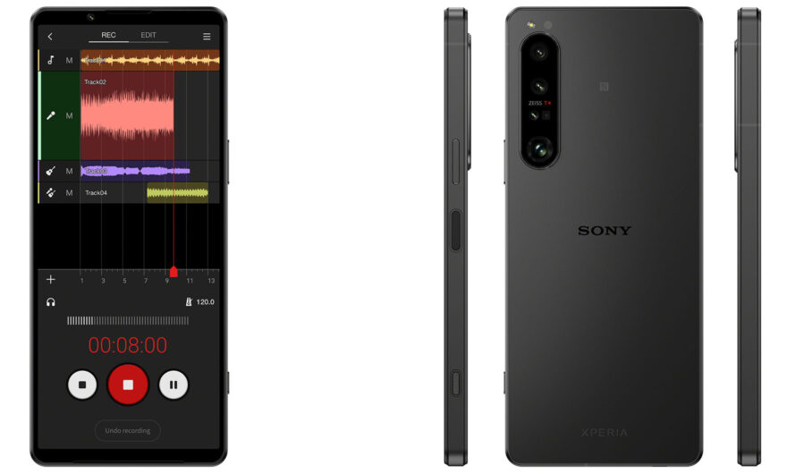 Seitenansichten des Xperia I1 IV, wobei in der Frontalansicht auf dem Bildschirm die aktivierte Audioaufnahmefunktion zu sehen ist, mit professionelle ATonaufnahmen gelingen sollen.