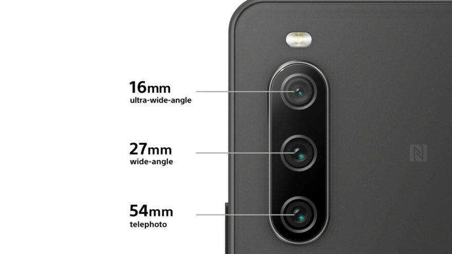 Hauptkamera | Triple-Kamera . Weitwinkel-Kamera/Objektiv Auflösung: 12 Mpx Sensorgrösse: 1/2,8” Exmor R for mobile Sensor Blende: F1.8 Brennnweite: 27 mm Blickwinkel: 79° – Normal-/Telekamera/Objektiv Auflösung: 8 Mpx Sensorgrösse: 1/4,4″ Blende: F2.2 Brennnweite: 54 mm Blickwinkel: 43° – Super-Weitwinkel-Kamera Auflösung: 8 Mpx Sensorgrösse: 1/4” Blende: F2.2 Brennnweite: 16 mm Blickwinkel: 120° |