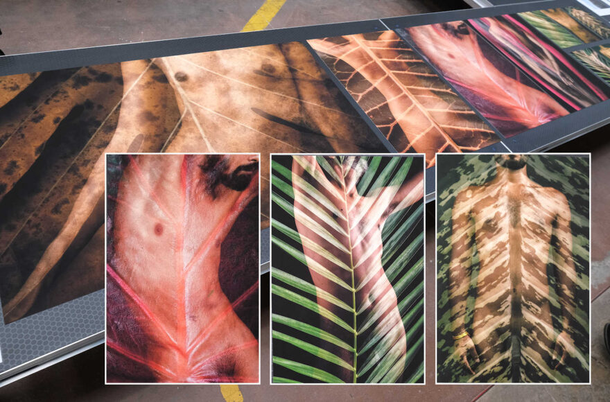 Coni Hörler, der heute in Indien lebt, nutzt Doppelbelichtungen für seine Studie über botanische Anthropologie und verschmelzende Koexistenz: Blätter und Häute, Formen und Körper. Schutz und Trennung, Berührung und Gefühl. Synthese und Einheit, eine Verbindung von Natur und Mensch. «Der Strom des Lebens, unsere Adern, der Mikrokosmos-Makrokosmos, unsere Lebenslinien, unsere Zeichen und Formen. Alles wird eins».