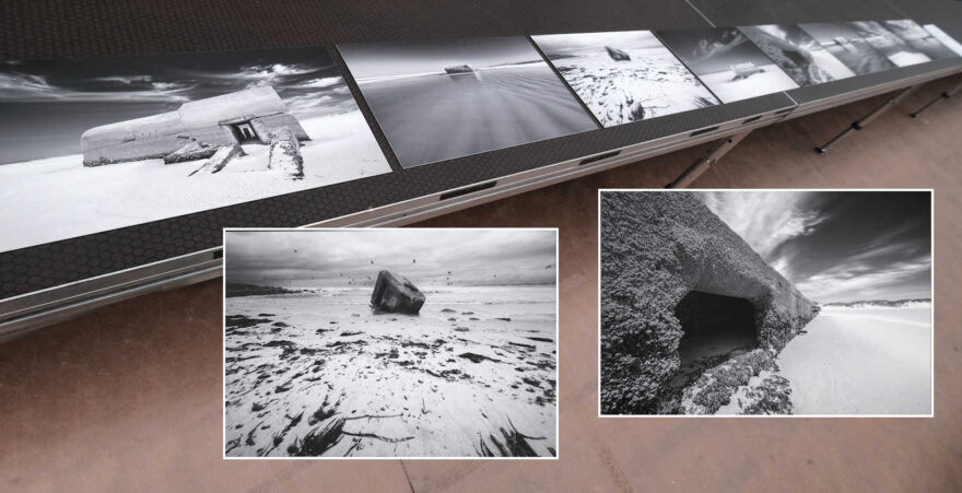 Oliver Schmid, Autodidakt aus Bern, hat verstreute Betonklötze einstiger Bunker des Atlantikwalls als Motive gewählt, die durch die Kraft der Gezeiten auf dem sandigen Untergrund zu bizarren Solitären geworden sind. Es sind Mahnmale monströser Weltgeschichte und grandiose Landschaftsskulpturen zugleich, die von Ebbe und Flut stets neu inszeniert werden, jedoch letztlich dem Untergang geweiht sind.