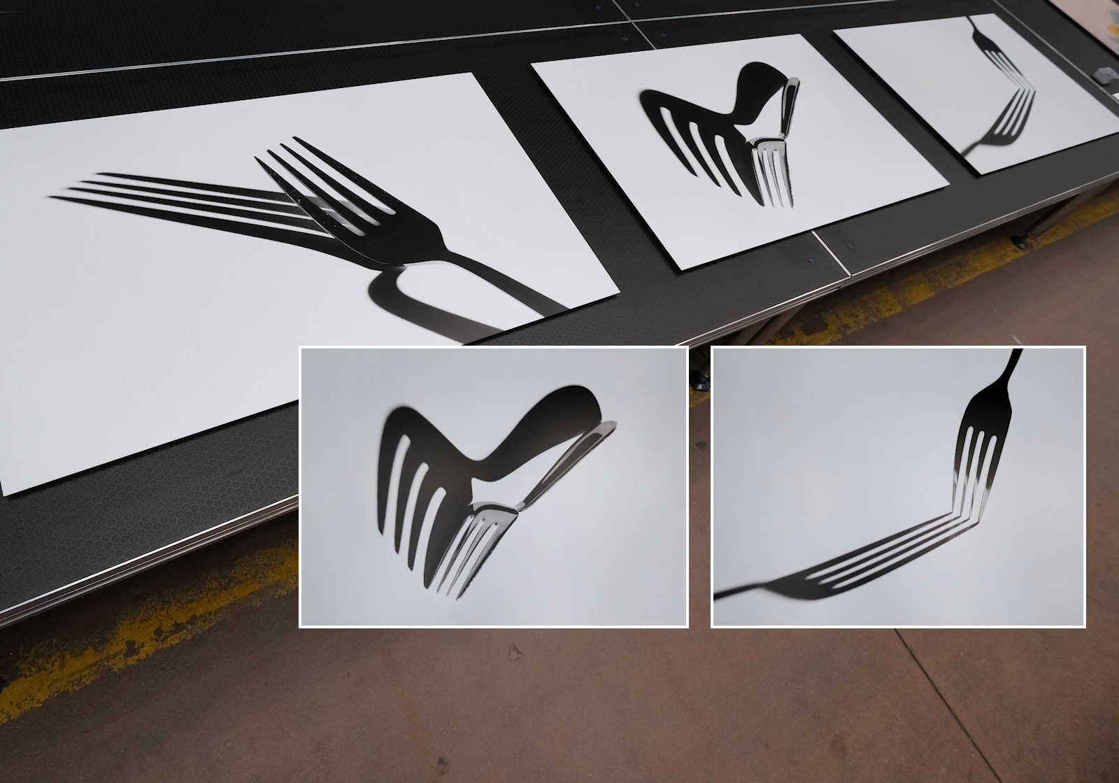 Philipp Siegel hat das einfache Motiv einer Gabel gewählt, deren Schatten im harten Licht abstrakte Formen annehmen. Er zitiert dabei Leonardo DaVinci: «Einfachheit ist die höchste Stufe der Vollendung».