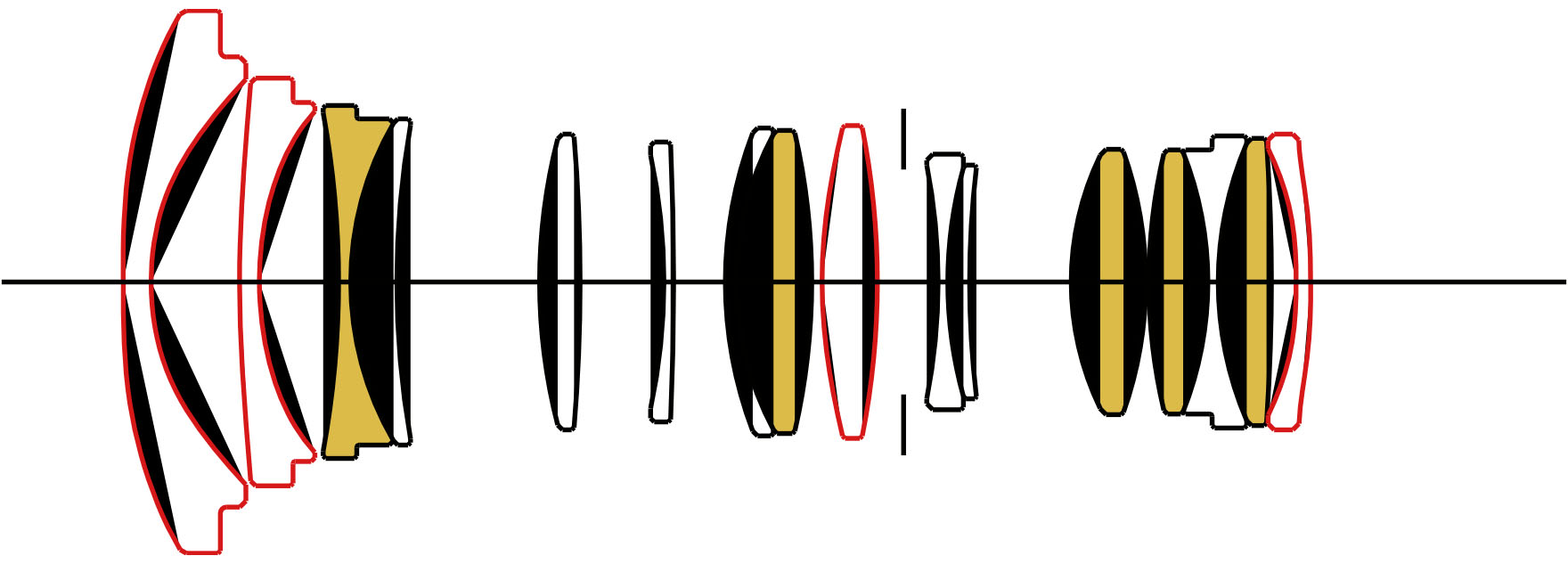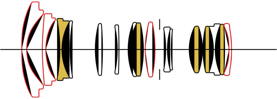 Die Objektivkonstruktion besteht aus 16 Elementen bzw. Linsen in 11 Gruppen. Unter den optischen Elementen sind (gelb) fünf FLD- und (rot) vier asphärische Linsen.