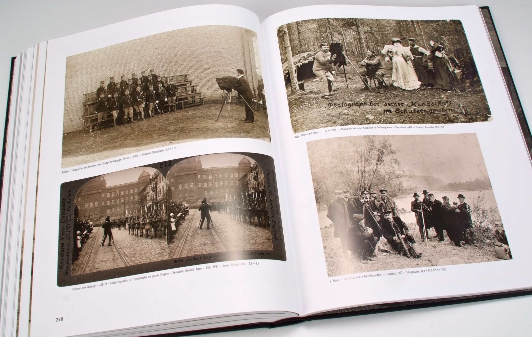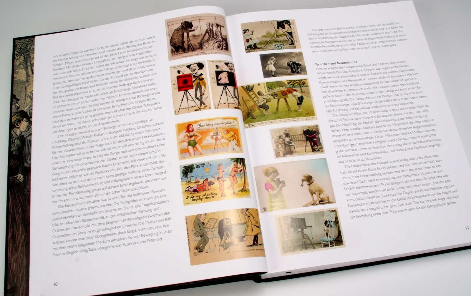 Die über 500 Bilder in diesem Buch decken das Thema sehr vielfältig ab. Viele der Bilder regen zum Schmunzeln an und wollen in der heutigen Zeit gar nicht so richtig ernst genommen werden. Andere zeigen uns Porträts bekannter Fotografen, deren Namen man von ihren Werken her kennt, die man aber selbst nur selten oder noch nie im Bild gesehen hat. Dann geben und die Bilder fotogeschichtlich interessante Hinweise auf die damals verwendeten Utensilien und Kameras, meist Riesenungetüme, denn man fotografierte ja lange Zeit auf grossformatigen Glasplatten, die dem vom Kunden gewünschten Endformat des Bildes entsprachen. Und je grösser der fotografierende Holzkasten auf dem Bild war, desto eindrucksvoller war die Werbebotschaft für den Fotografen.