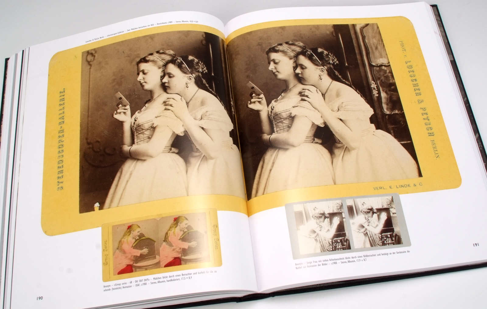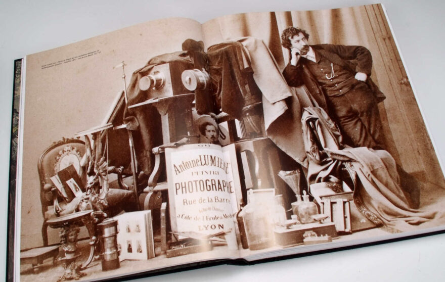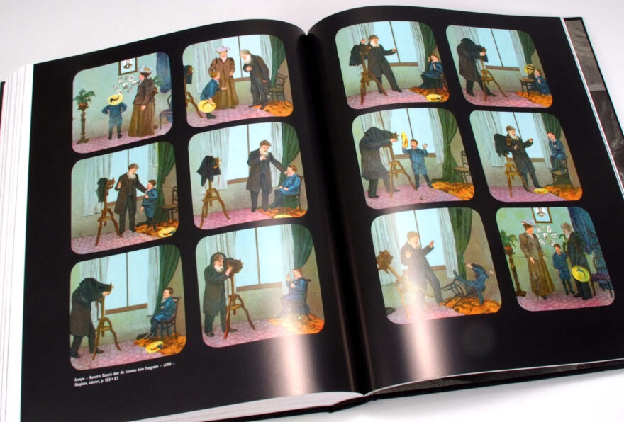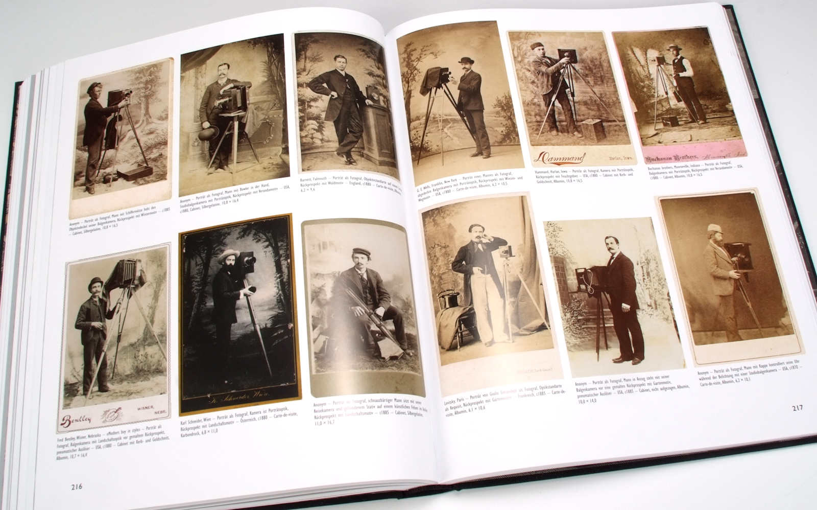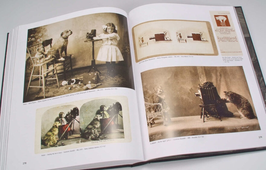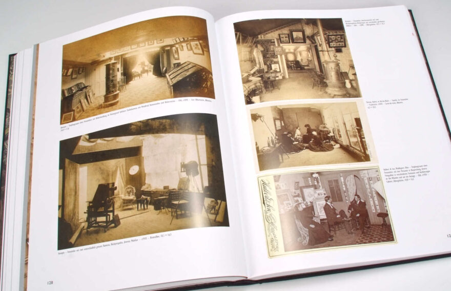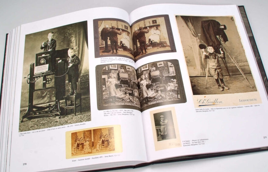 Dann gibt es in dem Buch natürlich auch viele inszenierte Bildbeispiele, Kinder, die Fotograf spielen und andere Kinder oder Haustieren zu fotografieren scheinen, dann Genrebilder, welche dazu dienten eine Geschichte zu erzählen, zum Beispiel die Sitzung beim Fotografen, das Wirken in der Dunkelkammer oder bei Retuschieren der Bilder. Weiter gibt es Bilder, die lediglich die mehr oder weniger prunkvolle Einrichtung der Studios zeigen, ohne dass sich der Fotograf selbst im Bilde präsentiert. Sie vermitteln uns einen Eindruck, wie unterschiedlich Fotostudios damals aussehen konnten und was man an Requisiten alles brauchte, um eine personengerechte Umgebung zu simulieren. Oder es gibt eine Fülle von Beispielen von Carte-de-visite Rückseiten, auf denen interessante Studioansichten oder Embleme der Fotografen zu sehen sind – was ein beliebtes Photographica-Sammelgebiet für sich ist.