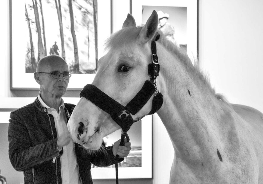 Hannes Schmid brachte eine Überraschung mit an die Vernissage. Allerdings schien das Pferd von den Bildern nicht sonderlich beeindruckt, sondern liess seiner Notdurft freien Lauf – sehr zum Unwohl der Organisatoren und denjenigen, die hinterher alles aufwischen mussten … (Foto: IPFO / Finja Basan)