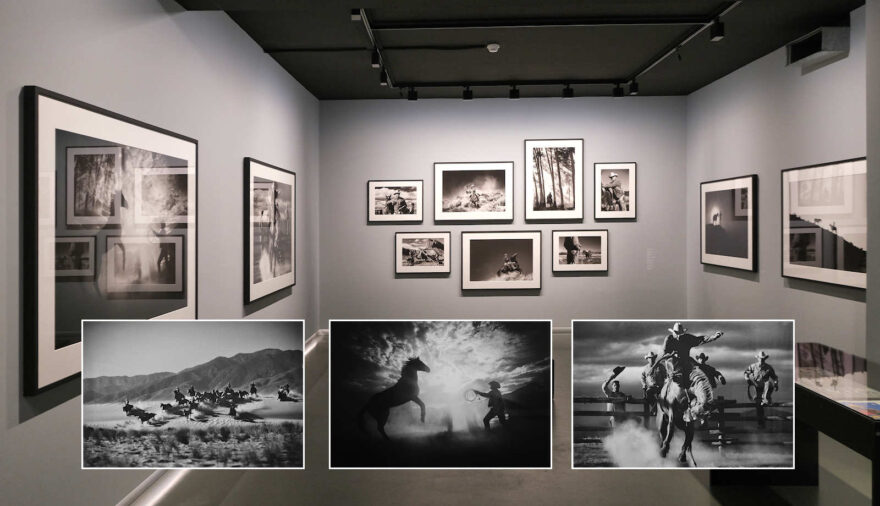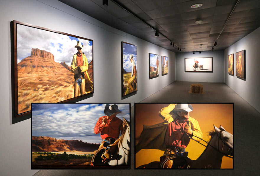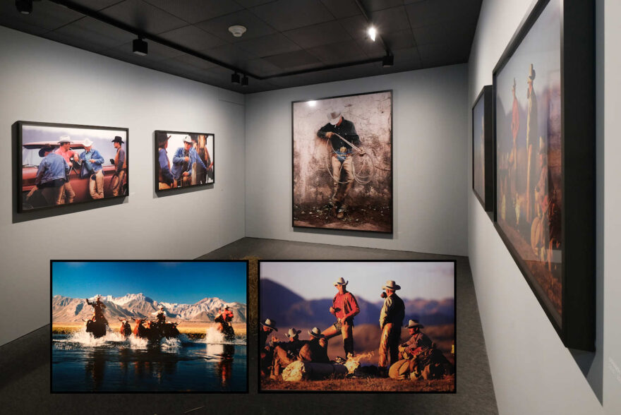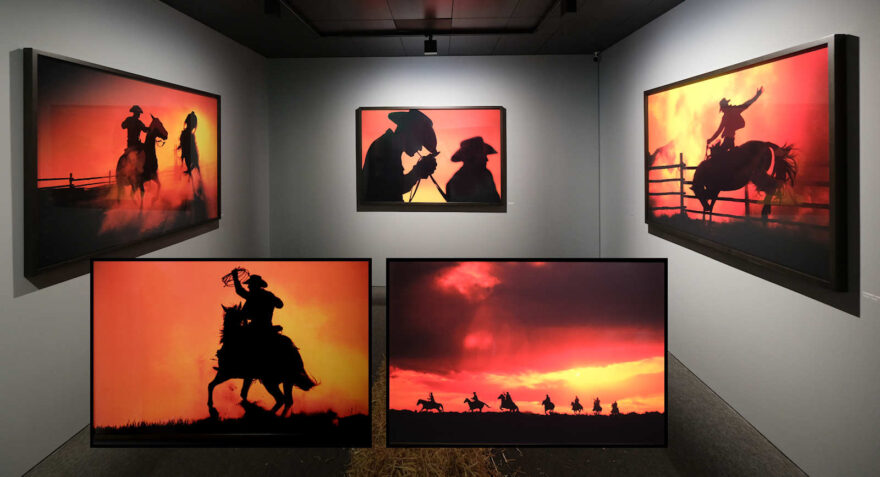 Im Obergeschoss tauchen wir ein in die Welt der Cowboys mit den leuchtenden Abendstimmungen, ihrem Aussehen, Charakter und Verhalten. Die Bilder sind stark geprägt von filmischen und fotografischen Szenerien – ganz im Stil der legendären Marlboro-Werbekampagnen und wahrscheinlich an deren Rand entstanden.