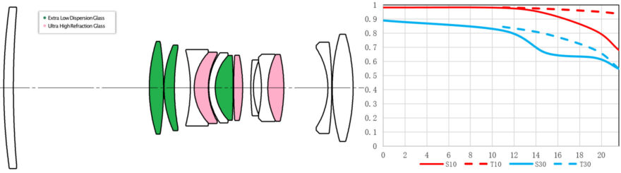 Das Objektiv enthält 13 Linsenelemente in 10 Gruppen, worunter sich 3 HFR- und 3 ULD-Linsen befinden