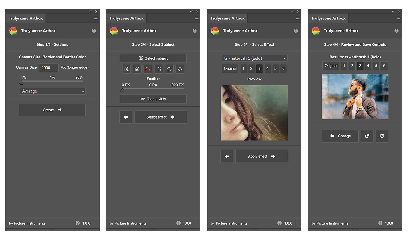 Das «Trulyscene Artbox»-Plug-in führt Anwender in vier simplen Schritten zu einzigartigen Ergebnissen. Anwender kombinieren einfach die 48 verschiedenen im Plug-in enthaltenen Pinsel- und Effekte-Einstellungen, um ein Bild ganz nach ihrem Geschmack zu erschaffen. Jedes Mal, wenn man das Plug-in verwendest, erzeugt es individuelle Pinselstriche, sodass kein Kunstwerk dem anderen gleicht.