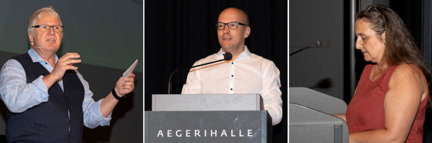 Überbringen Grussbotschaften und Gratulationen: Alex Mächler, Urs Bernet und Priska Garbani