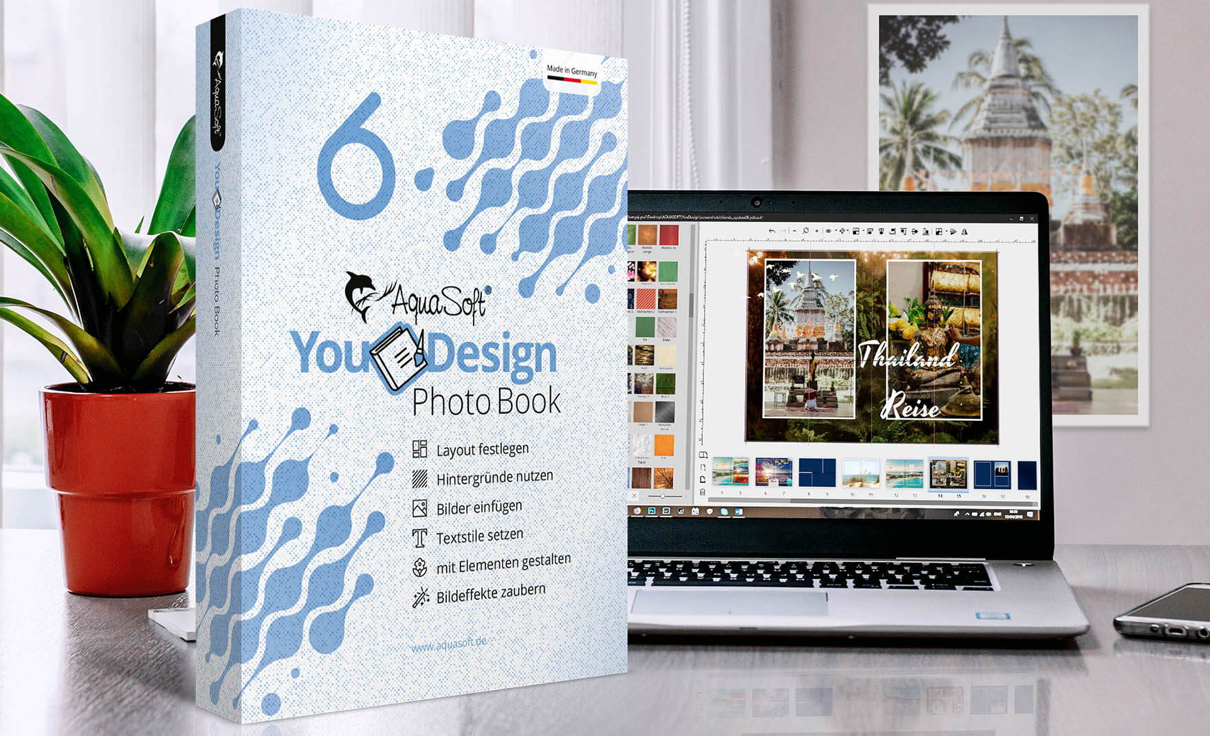 Die Software-Box von AquaSoft YouDesign PhotoBook und ein göffnetes Fotobuchprojekt auf dem Notebook-Bildschirm