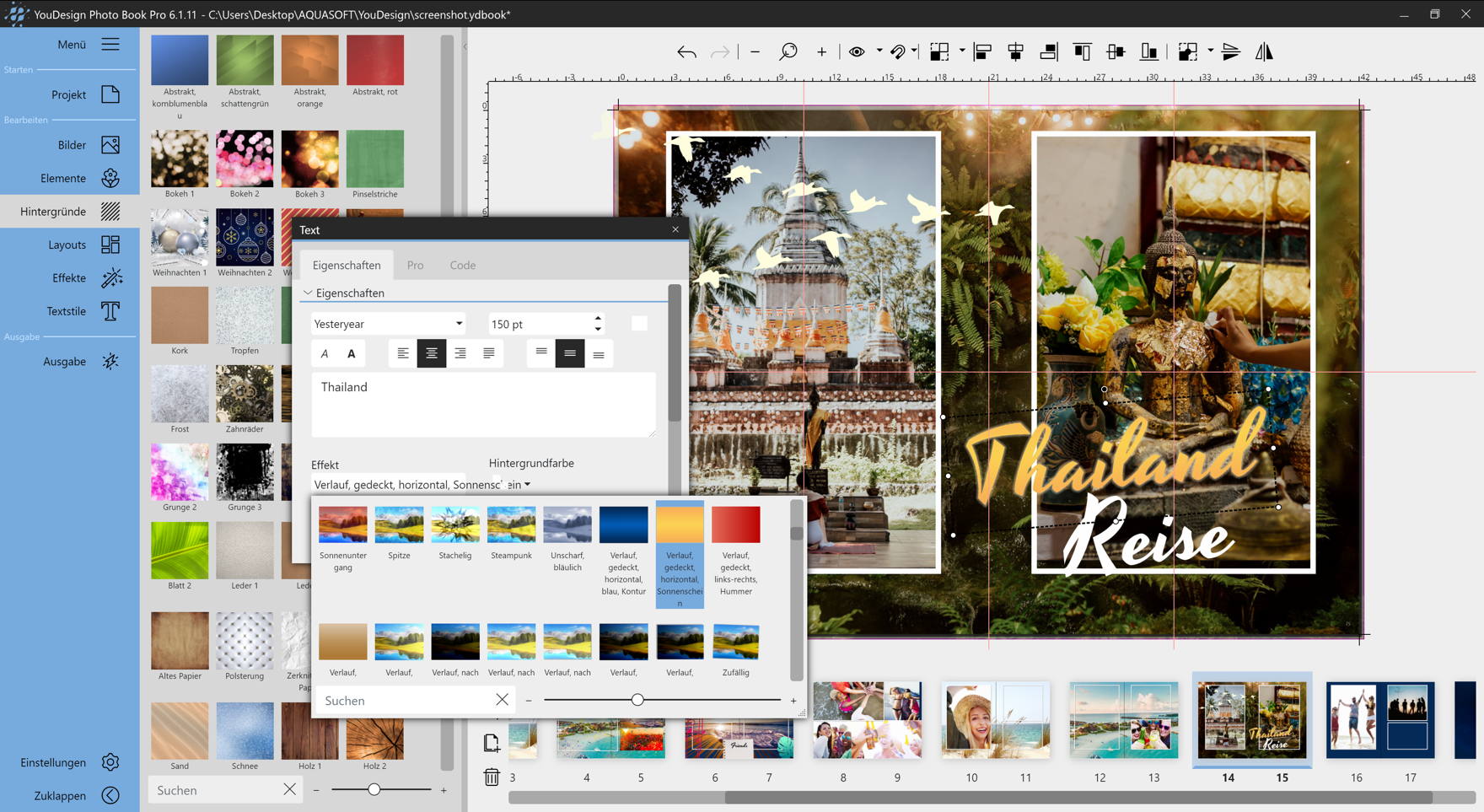 Pro-Version: Wer noch mehr Funktionen möchte, für den bietet AquaSoft die «YouDesign Photo Book Pro»-Version. Mit ihr lassen sich sämtliche Eigenschaften der exklusiven Designeinstellung detailliert editieren. Auch Ausgabeoptionen wie Auflösung und Schnittmarken sind individuell konfigurierbar.