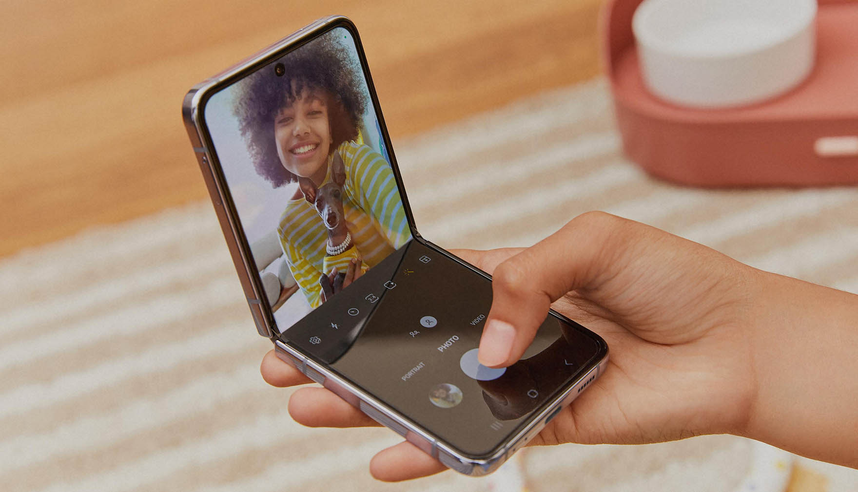Hochwertige Selfies mit der Hauptkamera aufzunehmen, ist mit dem Flip4 jetzt noch einfacher. Das liegt am verbesserten Quick-Shot-Modus auf dem Cover Screen. Nutzerinnen und Nutzerdes Flip4 können Selfies neu auch im Porträtmodus aufnehmen und sehen auf dem CoverScreen eine Vorschau im tatsächlichen Bildverhältnis. Werden im Quick-Shot-ModusVideoaufnahmen gestartet, werden diese beim Übergang in den Flex-Modus nicht unterbrochen.Die Aufnahme setzt sich also fort, wenn das Flip4 im Kameramodus zusammengeklappt oder geöffnet wird.